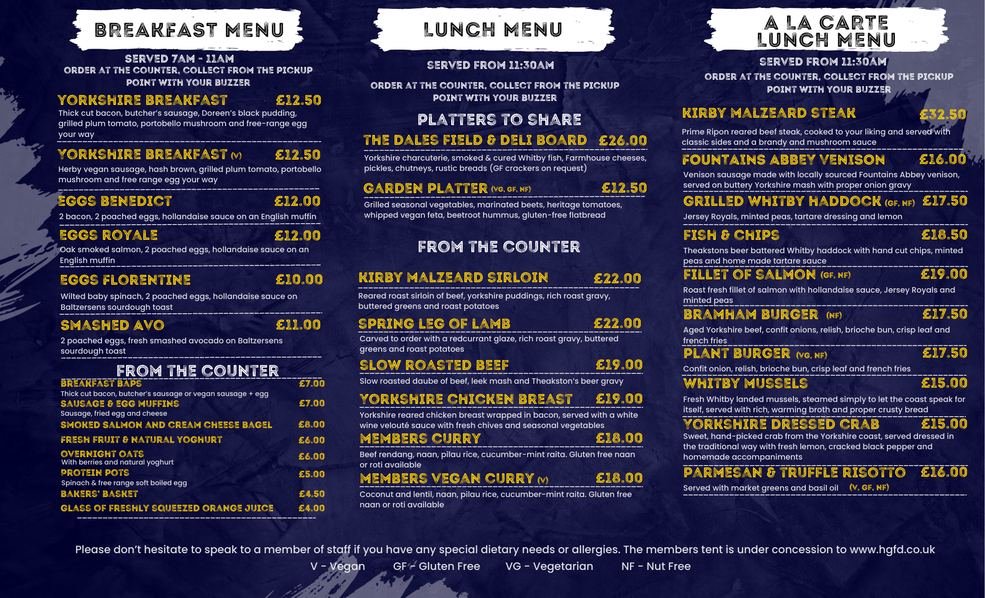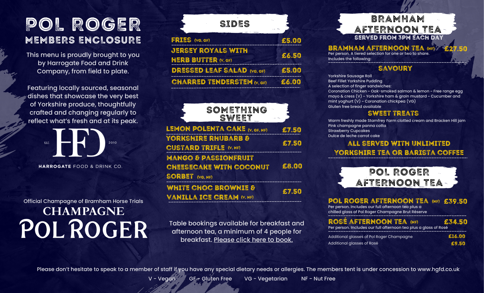 Enjoy a relaxed and elegant setting while taking in the atmosphere of the event, with the perfect place to start your day or unwind in the afternoon. Use the booking system below to make a reservation, please note, this is only for Breakfast and Afternoon Tea, a minumum of 4 guests for breakfast and 2 for afternoon tea. This is only available for visitors with Membership tickets.
